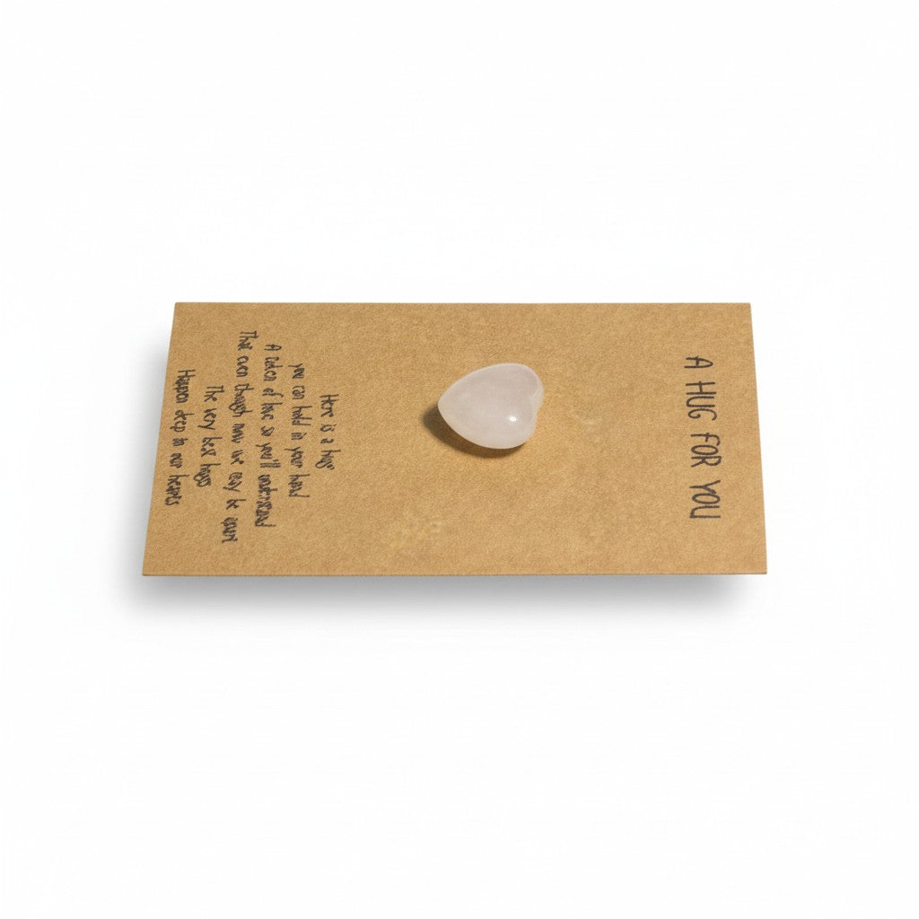 Experience a heartwarming gesture with A Hug From Me To You. This unique product features a genuine rose quartz heart on a beautifully designed card, creating a thoughtful and heartfelt gift for your loved ones. Show them how much you care with this one-of-a-kind hug.