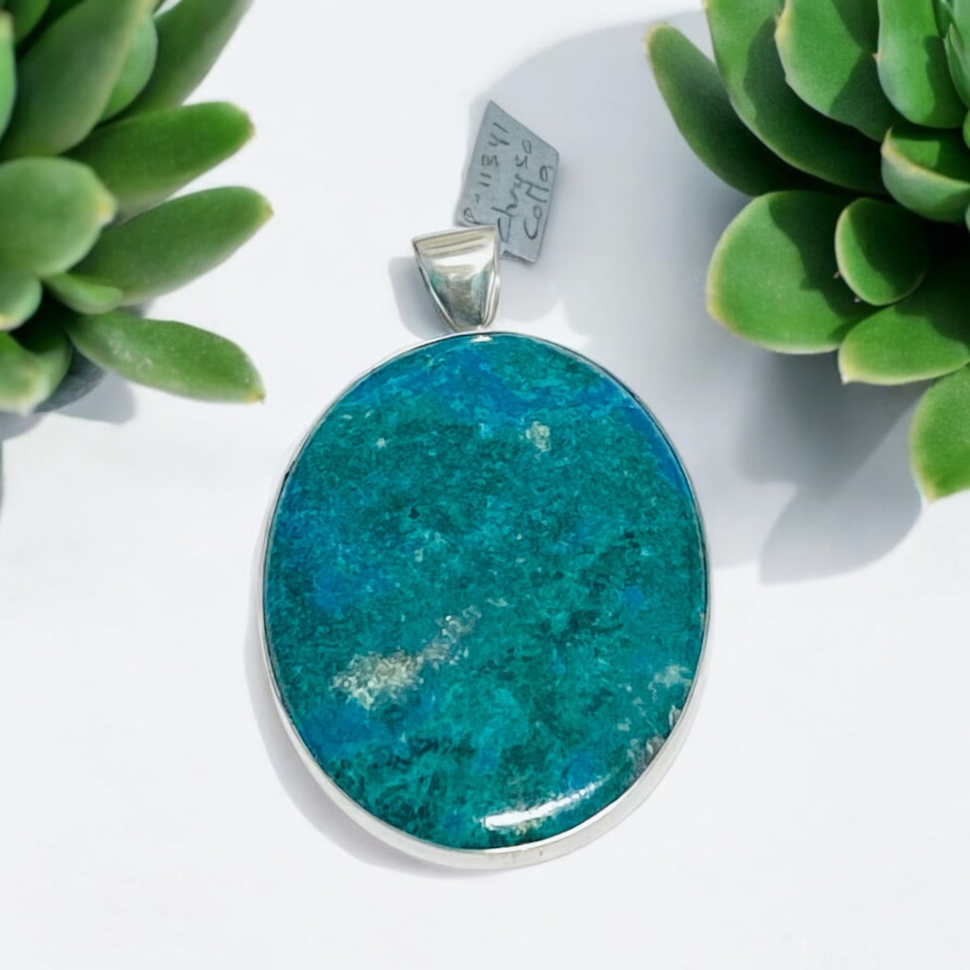 This Chrysocolla Oval Pendant Silver is expertly crafted with a unique oval shape and features genuine chrysocolla stone. Its stunning design brings a touch of elegance to any outfit. The pendant's sterling silver chain adds a subtle shine, making it the perfect accessory for any occasion.