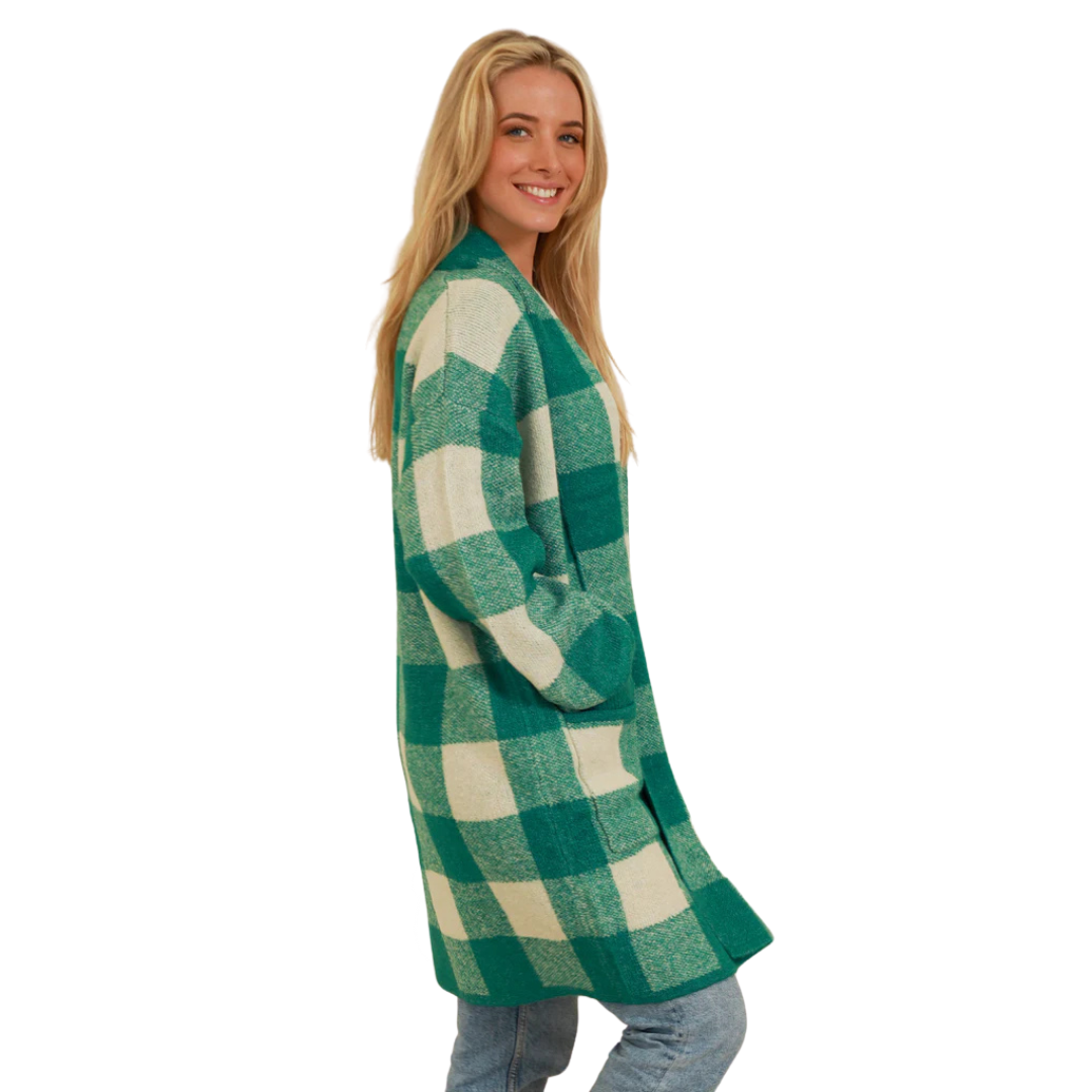 Stay cozy and stylish with our Emerald Check Knitwear Cardigan. The perfect addition to your fall wardrobe, this Charlotte The Label cardigan boasts a trendy green check pattern and comfortable knit fabric. Look effortlessly chic while feeling comfortable all day long.