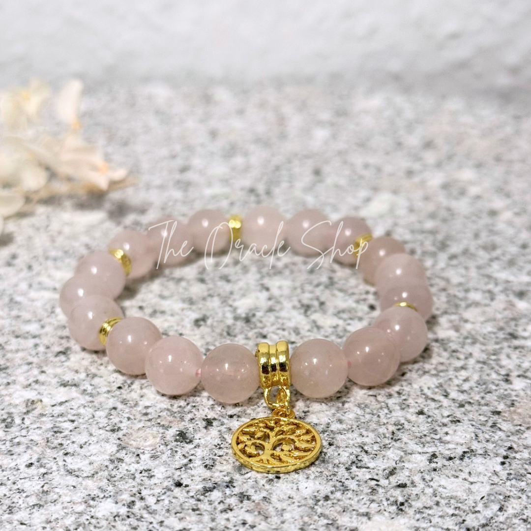 This Gold TOL-Rose Quartz Bracelet features a stunning rose quartz crystal and a beautiful gold tree of life symbol. The healing properties of rose quartz combined with the grounding energy of the tree of life make this bracelet a perfect addition to any spiritual practice.