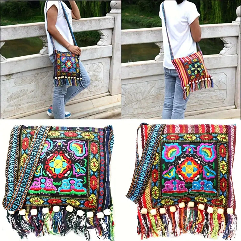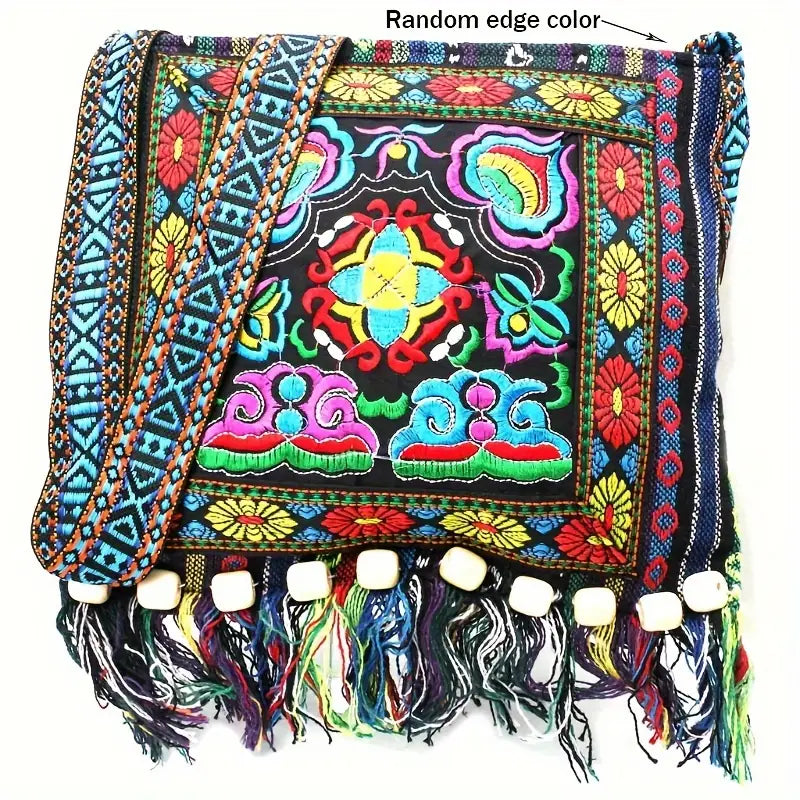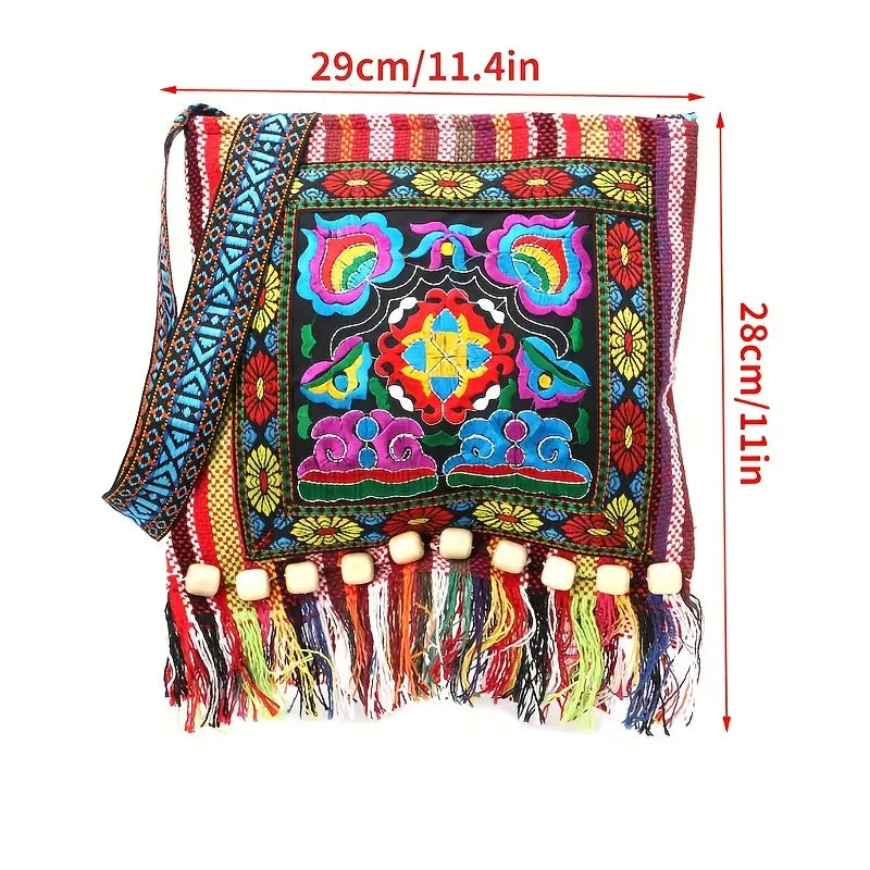 Bohemian Chic - Intricately Embroidered Vintage Tassel Bag with Floral Design - Versatile Crossbody Shoulder Bag for Fashion-Forward People