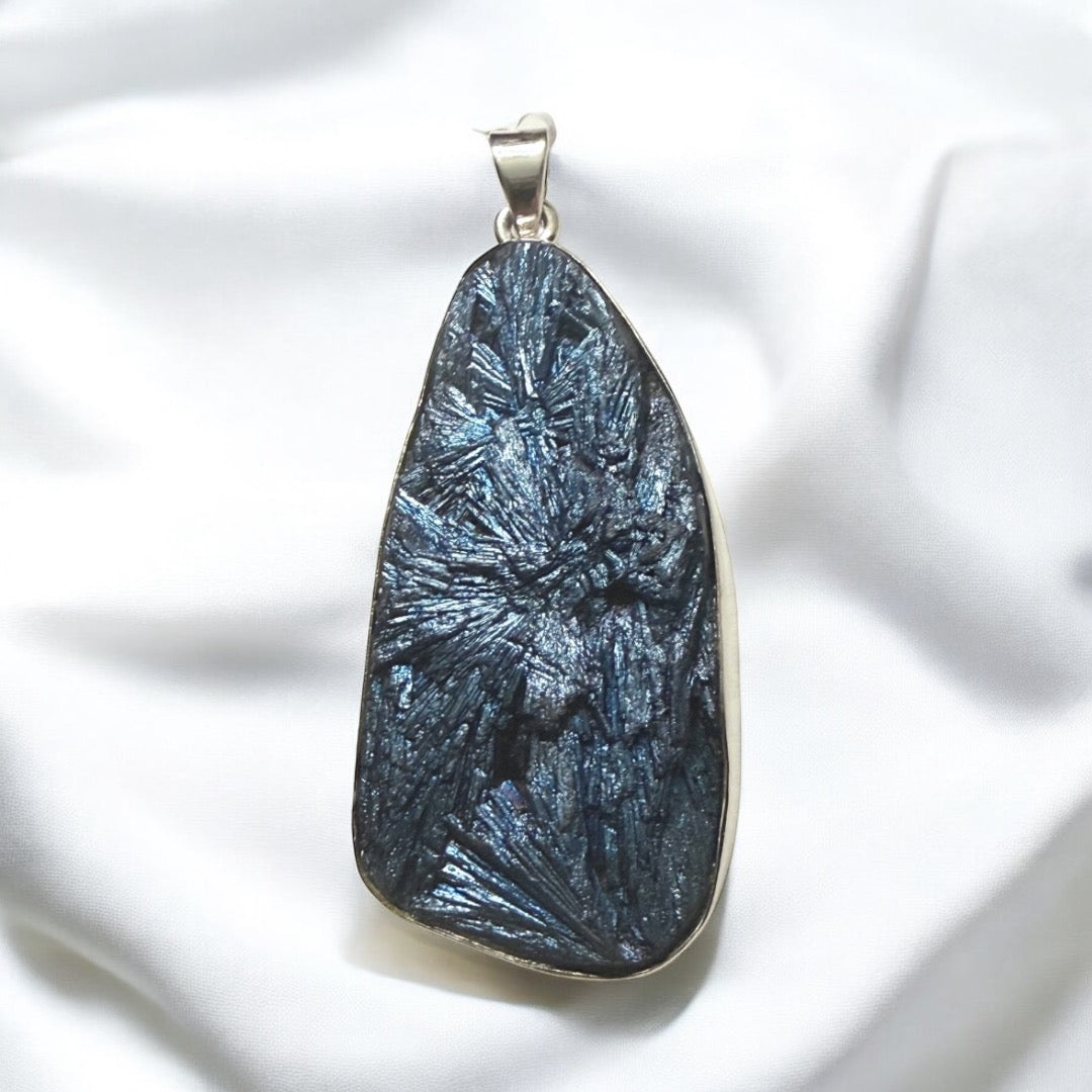 Kyanite Aura Feathers Oval Pendant in Silver