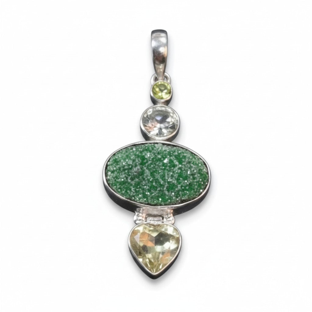 Uvarovite - Your Rare Abundance Activator Meet the emerald of the garnet world! This stunning green crystal druzy is nature's way of saying "let's get abundant." Uvarovite works its magic on your heart chakra, opening doors to spiritual wealth, material blessings, and all the love your heart can handle. Perfect for Aquarians and earth lovers alike, this beauty amplifies gratitude, strengthens your connection to nature spirits, and helps manifest those heart-whispered desires into reality. Consider it your personal abundance cheerleader wrapped in gorgeous green energy. π 6cm cabochon pendant ready to transform your energy game.