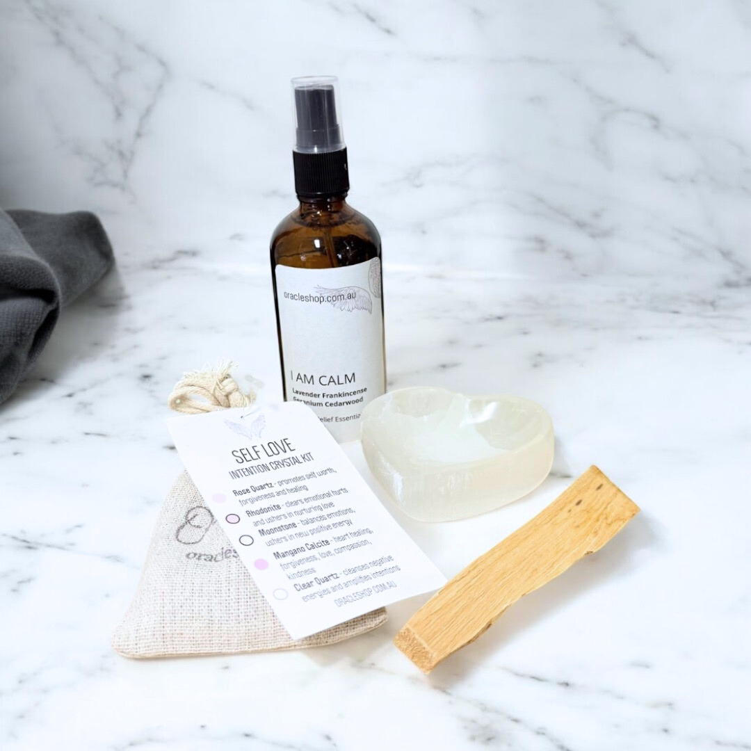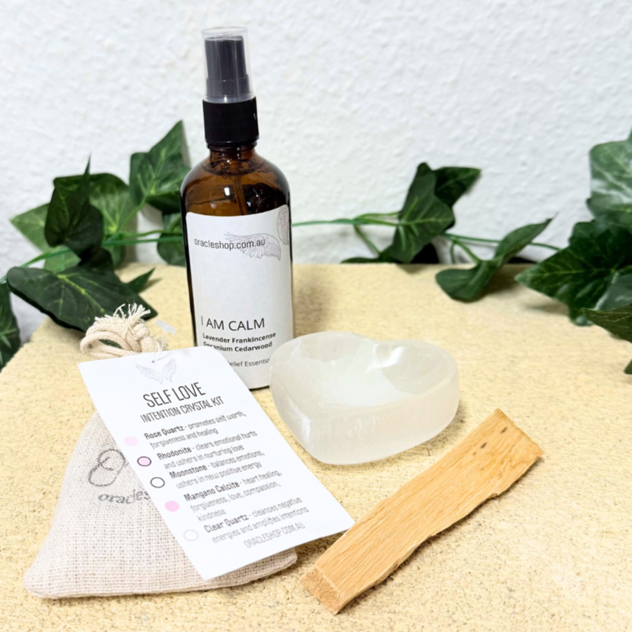 This delightful bundle features the soothing I am Calm mist to bring peace amid the chaos, a Self Love Crystal kit to nurture your inner glow, a palo santo stick to cleanse your crystals and soul, plus a charming selenite heart bowl perfect for holding your crystals or favourite jewellery.