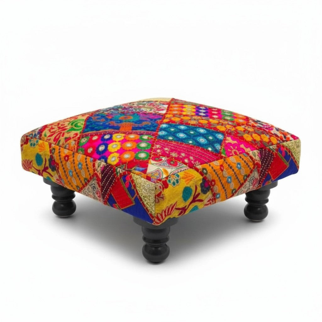 Add a splash of global charm to any room with this playful Tibetan footstool. Handmade in India, its vibrant cotton patchwork features embroidered details that make each piece uniquely yours. The wooden legs provide sturdy support while the compact size fits perfectly as a quirky seat or footrest. Enjoy the surprise of varied patch placement, while the cheerful line colours stay bright and consistent. Perfect for creative spaces that love a touch of unexpected fun!
