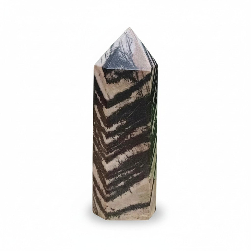 Zebra Jasper Tower 001 is your go-to stone for grounding and good vibes. This striped beauty works like a spiritual security blanket, keeping you steady when life gets wobbly. Known as nature's ultimate cheerleader, Jasper wraps you in calm energy while shielding you from negativity. It's the perfect companion for turning your wild ideas into reality and harmonising your inner yin and yang. Whether you're balancing your chakras or just need a little extra stability in your day, this tower brings wholeness and tranquility to your space. A must-have for anyone seeking grounded, feel-good energy.